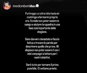 LECCE – La frustrazione di Medon Berisha, dopo l’ennesimo infortunio che gli ha fatto finire anzitempo la stagione agonistica a causa di problemi al retto femorale della gamba destra, è tutta nelle parole pubblicate in una storia sul proprio profilo Instagram in cui si diuce “devastato” per il guaio muscolare patito ma determinato a tornare quanto prima possibile. Un pensiero rivolto ai tifosi del Lecce ma anche ai suoi compagni di squadra impegfnati nella rincorsa alla salvezza in questo finale di stagione che non vedrà il centrocampista albanese tra i protagonisti in campo.