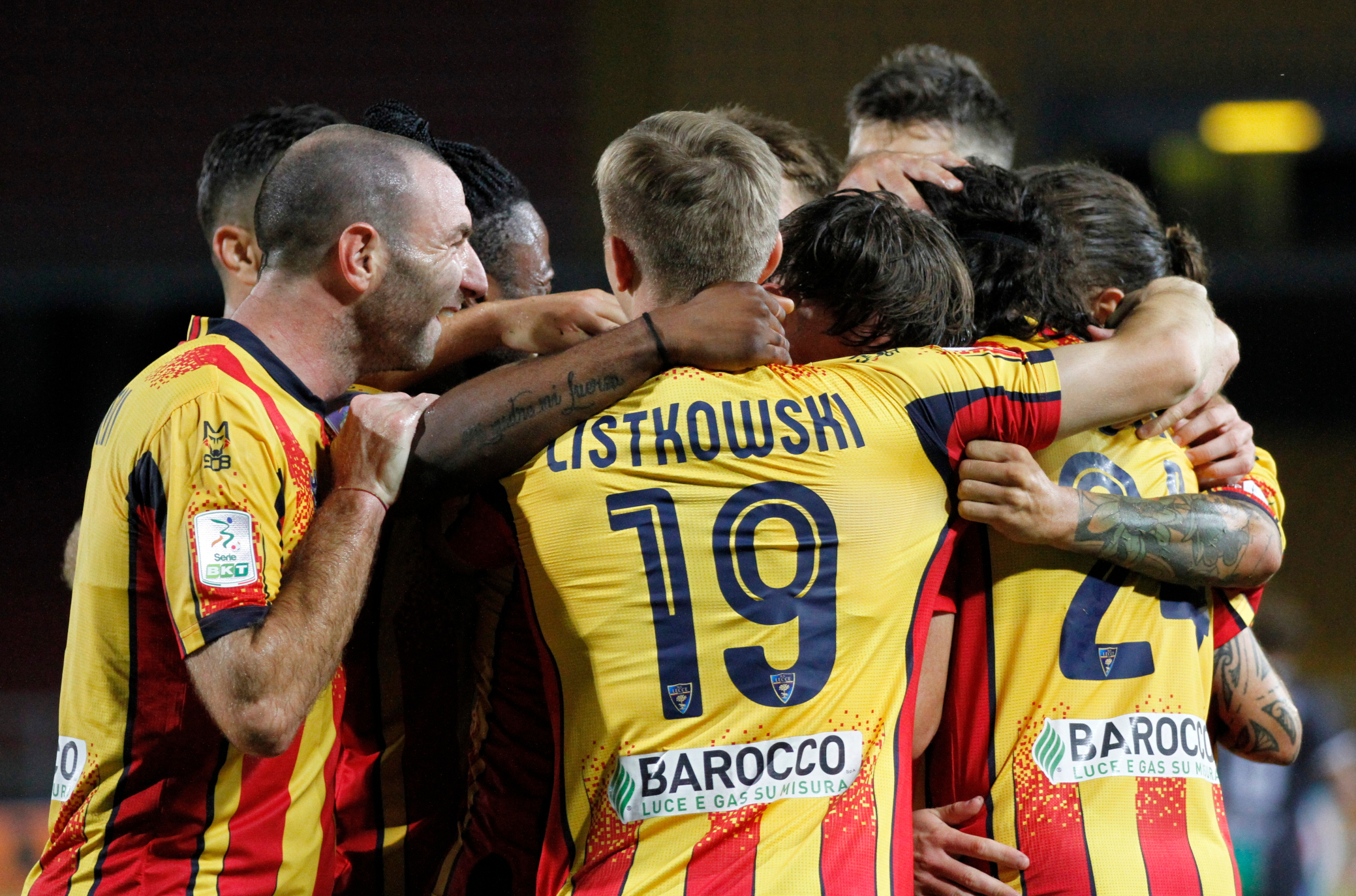 esultanza Lecce dopo rete di Hendersn contro Feralpisalò